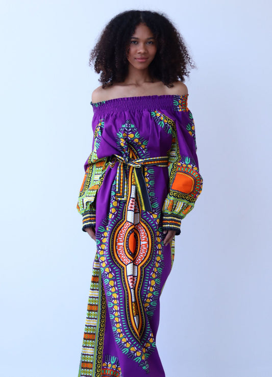 African Dashiki Long Dress - Long Sleeve Off Shoulder Shirt